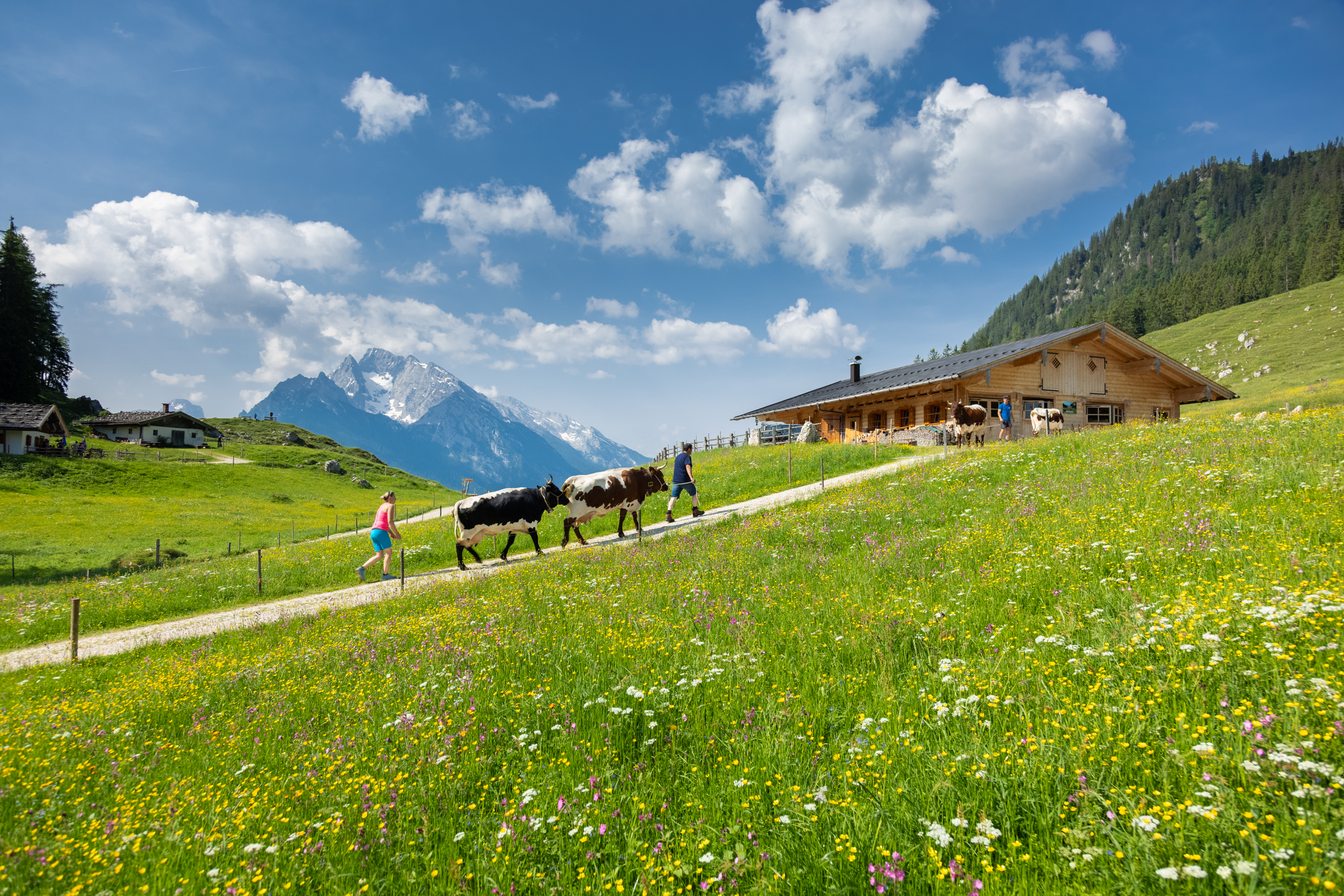 Vom Parkplatz Taubensee erreichen Sie als Erstes die Mordaulm. Der Almerlebnisweg ist beschildert und führt von der Mordaualm nach links zur unbewirtschafteten Lattenbergalm. Kleiner Geheimtipp: Bevor Sie zur Lattenbergalm kommen, queren Sie die Linie zwischen dem Gipfel des Jochköpfls auf 1.575 Höhenmetern und dem des Karspitz (1.641 Höhenmetern). Direkt an der Stelle, die einem großen „U“ gleicht, zweigen Sie nach links auf den unmarkierten Weg ab und machen einen kleinen Abstecher zum Gipfel des Jochköpls. Auf dem eigentlichen Weg wieder zurück, folgt die Lattenbergalm auf 1.480 Höhenmetern, gefolgt von der bewirtschafteten Moosenalm auf 1.405 Höhenmetern. In Kehren geht es über die Schwarzbachwacht wieder an Ihren Ausgangspunkt, den Parkplatz am Taubensee zurück.