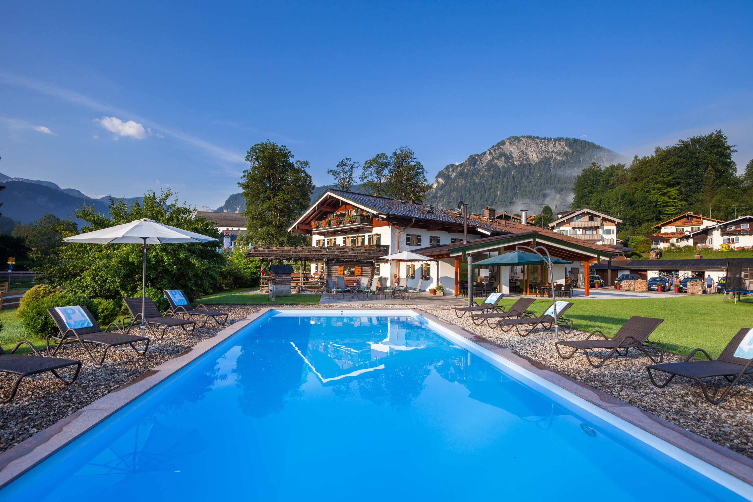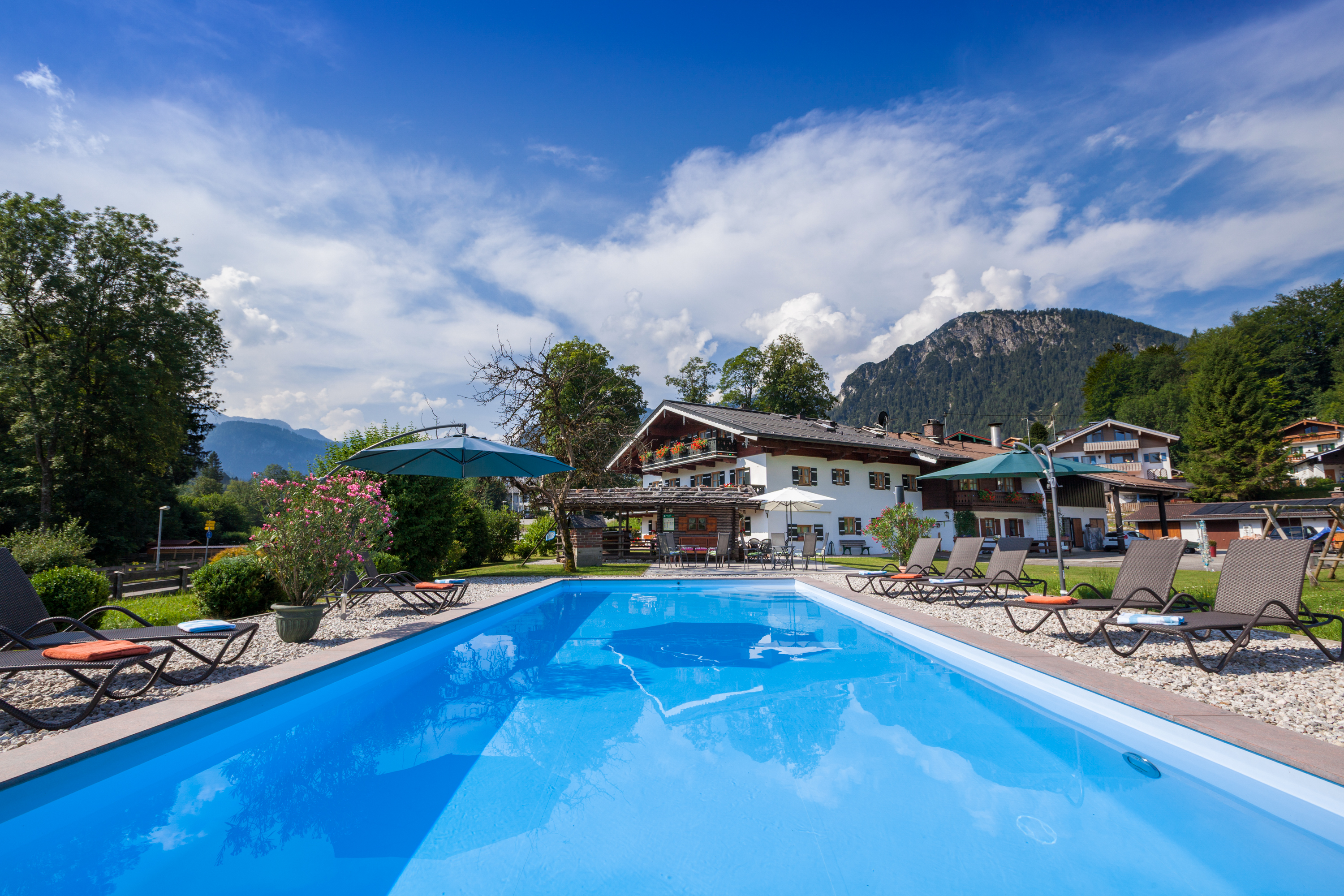 Die Berchtesgadener Bergwelt können Sie vom Balkon aus erblicken. Die klassische Finnische Sauna finden Sie in unserem Saunabereich. Bequeme Ruheliegen und großzügige Duschen runden das Saunavergnügen ab. Unser Dr. Kern Solarium lädt ebenfalls zur Erholung ein. Im Sommer können Sie sich in unserem 5 x 13 Meter großen Schwimmbecken erfrischen.