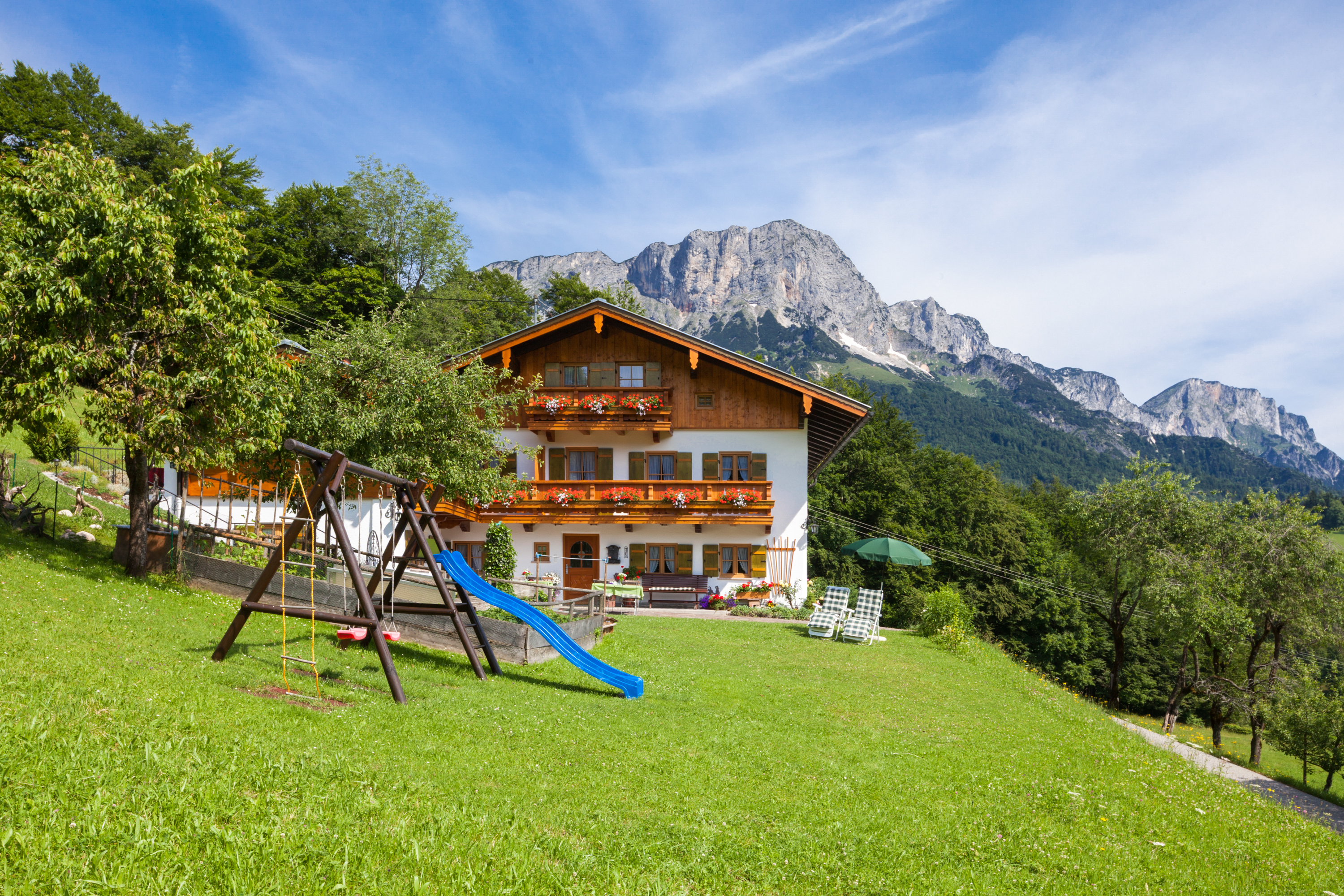 Auf unserer schönen großen Terrasse vor dem Haus treffen die ersten Sonnenstrahlen am Morgen. Dort können Sie bei herrlichem Bergblick ihr Frühstück genießen. Wir sind kinderfreundliche Gastgeber und haben einen kleinen Spielplatz mit Rutsche, Schaukel, Sandkasten und vielem mehr. Wir würden uns freuen, Sie als Gast begrüßen zu dürfen.