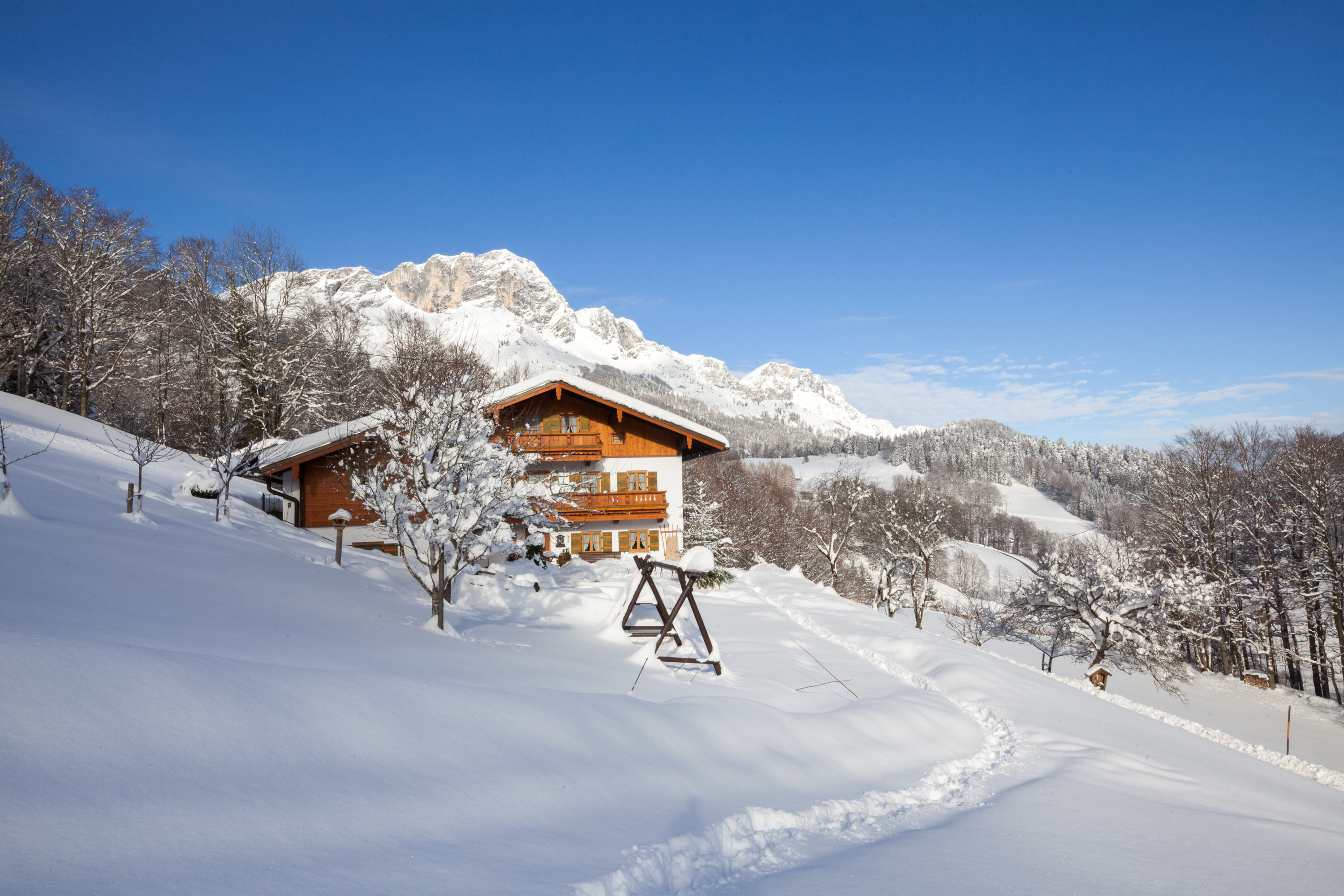 Unser kleiner, idyllisch gelegener Bergbauernhof Haus Frauenlob befindet sich auf 850 m in Maria Gern. Umgeben von hohen Gebirgsstöcken, die zum Wandern und Bergsteigen einladen, buntgemischten Bergwäldern und blumenreichen Wiesen können Sie bei uns die Ruhe genießen. Das Zentrum von Berchtesgaden ist per Bus oder mit dem Auto in 15 Minuten erreichbar. Unser Hof wird als kleiner landwirtschaftlicher Betrieb mit aktuell 4 Milchkühen, 2 Hasen und 1 Katze bewirtschaftet.